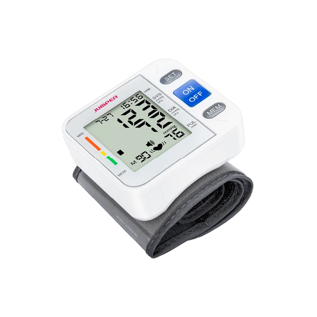 The Jumper Wrist Blood Pressure Monitor (JPD-900W), is an easy to use, portable device that takes blood pressure readings with the push of a button and displays results on a clear LCD display. It can store up to 90 readings in its memory, alert users when an abnormal heartbeat is detected, and display battery life.