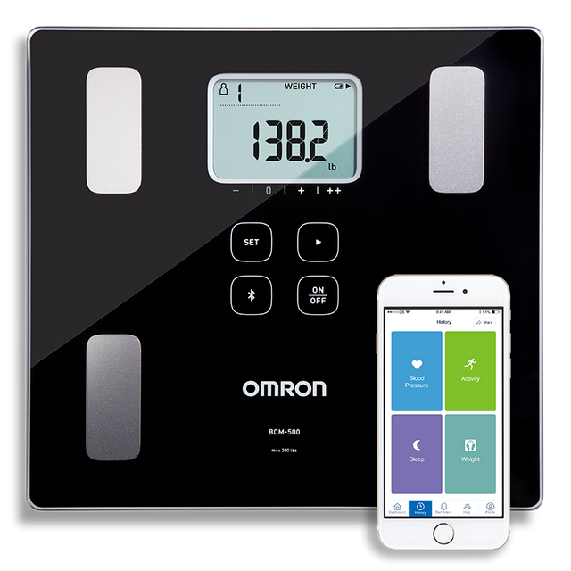 The Omron Body Composition Monitor & Scale (BCM-500) performs smart tracking of a comprehensive array of six body metrics. It seamlessly syncs data via Bluetooth for comprehensive tracking. This sleek weight scale accurately measures body weight, body fat percentage, visceral fat, skeletal muscle percentage, resting metabolism and body mass index, and can weigh individuals up to 330 lbs and 6.6 ft tall.