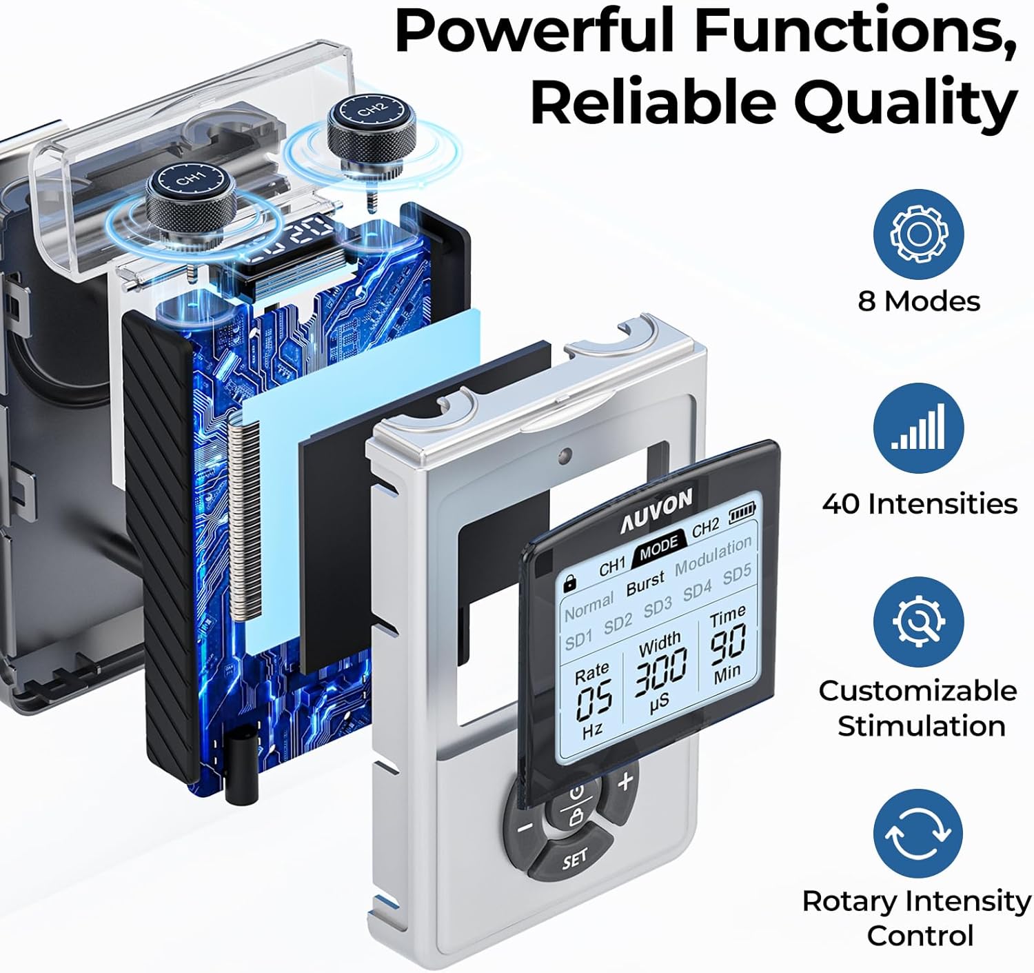 The AUVON PT1 Pro Rechargeable TENS Unit is designed for drug-free pain relief and muscle stimulation. Featuring 8 modes, 40 intensity levels, and a long-lasting 600 mAh rechargeable battery, it offers effective relief for sore muscles, chronic pain, and post-exercise recovery. Its compact design makes it convenient for home, work, or travel use.