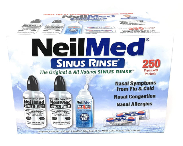 The NeilMed Sinus Rinse Value Pack is your all-in-one solution for nasal relief. This bundle includes two 8 fl. oz. squeeze bottles for easy, low-pressure rinsing, 250 premixed saline packets, and a bonus NasaMist Saline Spray for on-the-go moisture and relief. Whether you're managing cold symptoms, congestion, or seasonal allergies, this kit helps cleanse nasal passages and reduce irritation caused by allergens, bacteria, and environmental triggers.