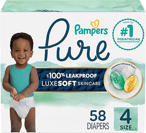 Pampers Pure Protection diapers in Size 4 (22–37 lbs) are crafted with plant-based materials and designed to be gentle on baby’s sensitive skin. With a shea butter–infused liner and hypoallergenic construction, they provide long-lasting leak protection while helping maintain healthy skin.